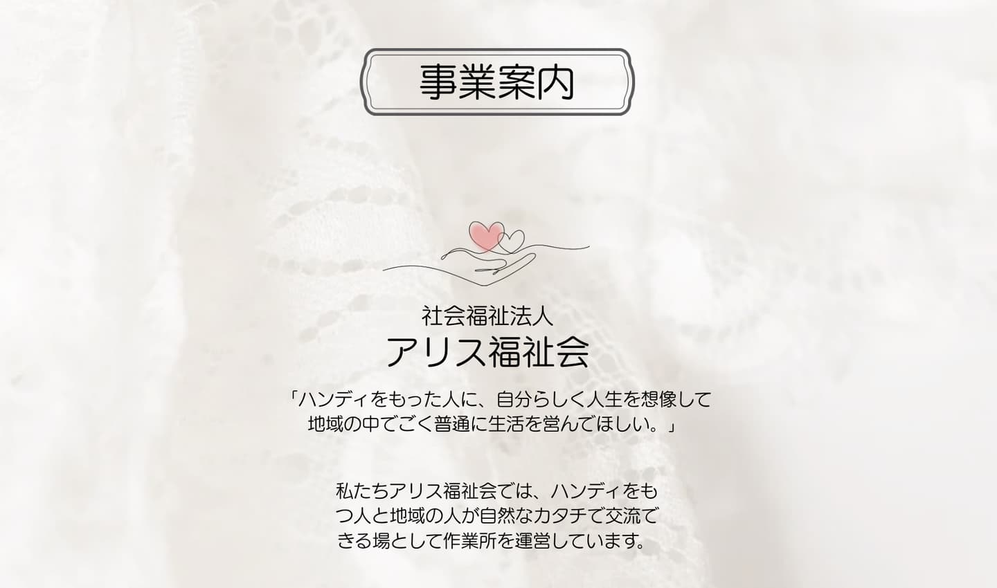 Alice's House Top アリスの家について 製作販売活動 ウィング 年間行事 お知らせ 人員募集 お問い合わせ アクセスマップ アリス通信 アリス福祉会 アリス福祉会 アリス福祉会 ウィング アリスの家 ウィング アリスの家 {"blogs":[{"sid":"SdxzfubEoE","categories":"","tags":"","order":"newer","name":"ブログ","pathToFolder":"./blog/","topfile":"top.html","rss":"1"}],"articleType":"1","limit_article_num":"3","article_disp_offset":"0","article_disp_offset_num":"","article_new_offset":"1","article_new_offset_num":"3"} [%article_date_notime_dot%] [%new:New%] [%title%] {"blogs":[{"sid":"SdxzfubEoE","categories":"","tags":"","order":"newer","name":"ブログ","pathToFolder":"./blog/","topfile":"top.html","rss":"1"}],"articleType":"1","limit_article_num":"3","article_disp_offset":"0","article_disp_offset_num":"","article_new_offset":"1","article_new_offset_num":"3"} [%article_date_notime_dot%] [%new:New%] [%title%] {"sid":"SdxzfubEoE","categories":"","tags":"","order":"newer","name":"ブログ","pathToFolder":"./blog/","topfile":"top.html","rss":"1"}{"blogs":[{"sid":"SdxzfubEoE","categories":"","tags":"","order":"newer","name":"ブログ","pathToFolder":"./blog/","topfile":"top.html","rss":"1"}],"articleType":"1","limit_article_num":"3","article_disp_offset":"1","article_disp_offset_num":"1","article_new_offset":"1","article_new_offset_num":"3"} カフェメニューはこちら カフェメニューはこちら クッキーはこちら ケーキはこちら クッキーはこちら ケーキはこちら 作品はこちら 作品はこちら プライバシーポリシー ページトップへ